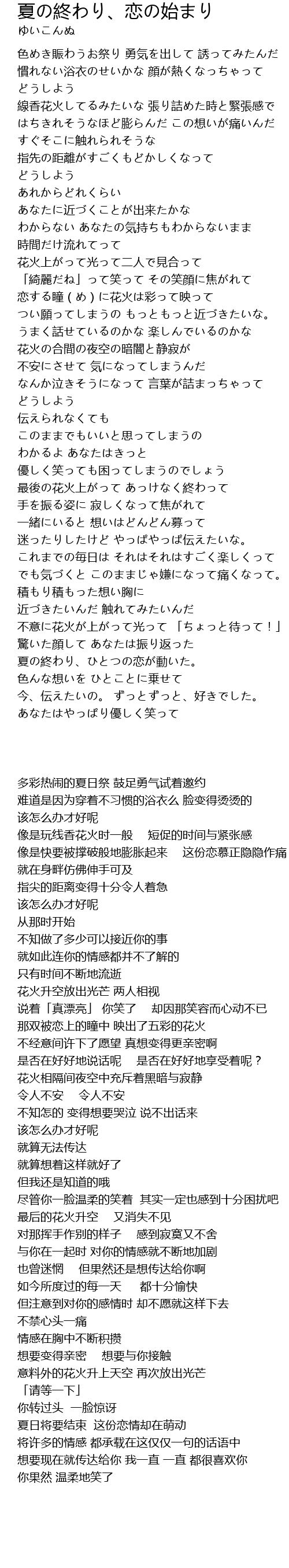 We hope you enjoy our entry~also enjo. 夏の終わり、恋の始まり [なつのおわり、こいのはじまり / natsu no owari,koi no hajimari] music&lyrics:すこっぷ movie:モゲラッタ ・すこっぷ氏 の28作目。 再生: 919,264 コメント: 35,077 マイリスト: 24,226. 夏の終わり、恋の始まり 歌ってみた verめいちゃん [音楽・サウンド] な に か お か し い。素敵な本家様:sm18632219mix:がおーさん mylist/30063539 @_gaooo_. Megpoid 上巻 exit tunes presents vocaloseasons feat. Gumi 作詞:すこっぷ 作曲:すこっぷ 色めき賑わうお祭り 勇気を出して誘ってみたんだ 慣れない浴衣のせいかな 顔が熱くなっちゃって どうしよう 線香花火してるみたいな 張り詰めた時と緊張感で はちきれそうなほど膨らんだ この想いが痛いんだ. 迷 まよ ったりしたけど やっぱやっぱ 伝 つた え. 夏の終わりに#5 ページ5 ・ 翌日 「自然と、隣にいてほしい…」 私は、昨日の光さんの台詞が頭の中をぐるぐると巡っていた。 海で、隣にいる光さん。 そこに安心感を覚えているのは事実で、 隣にいてほしい。 もうそこまで来てるのも段々分かってきて. F# 夏の終わり、ひ a# とつの恋 d#m7 が動い d# た。 色ん g#m7 な想い a#m7 を ひとこ b とに乗せ f#/a# て 今、 g#m7 伝えたい a#m7 の。ずっ b とずっ bm と、 n.c 好きでした。 f# a# d#m7 d#. つい 願 ねが ってしまうの もっともっと 近 ちか づきたいな。.